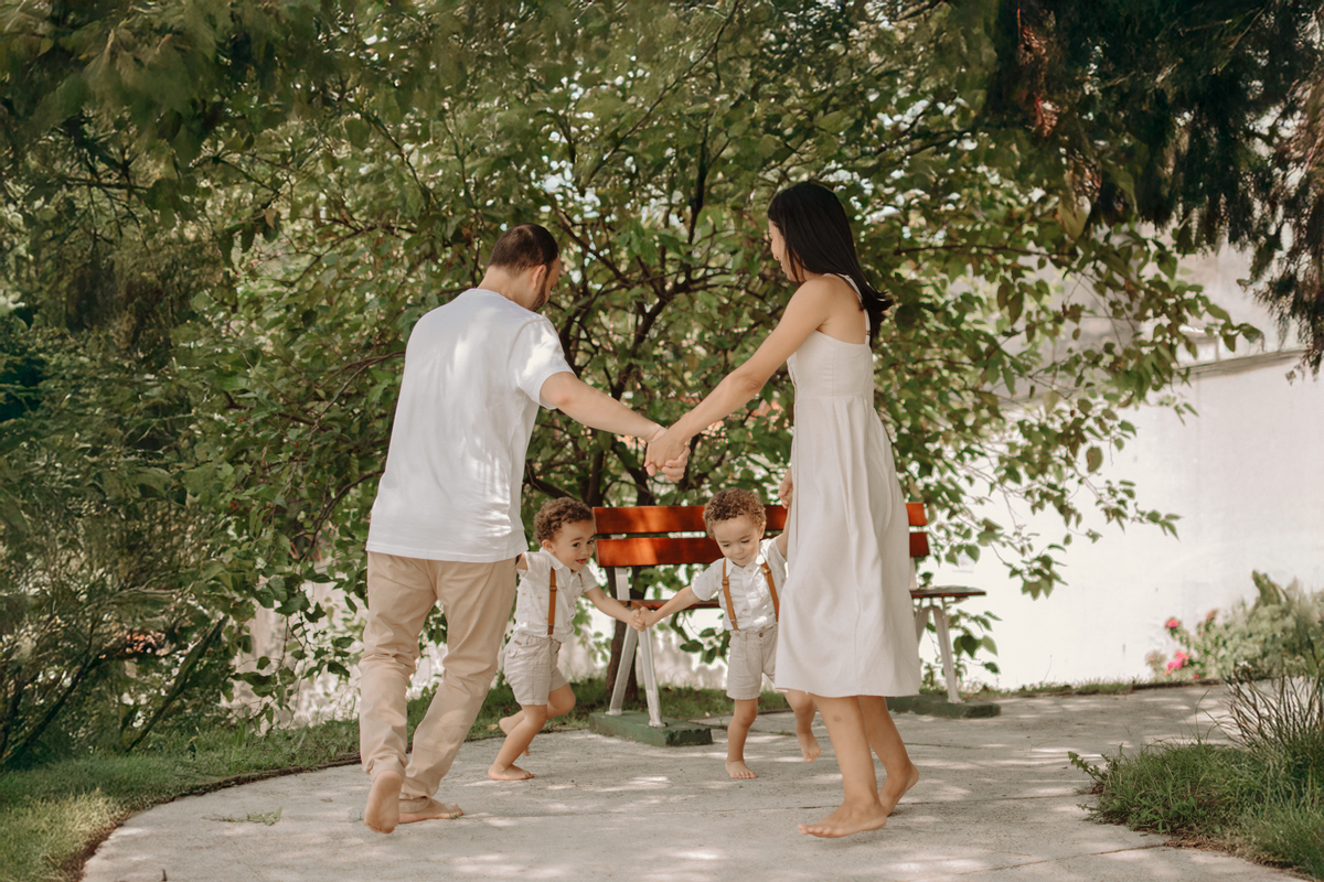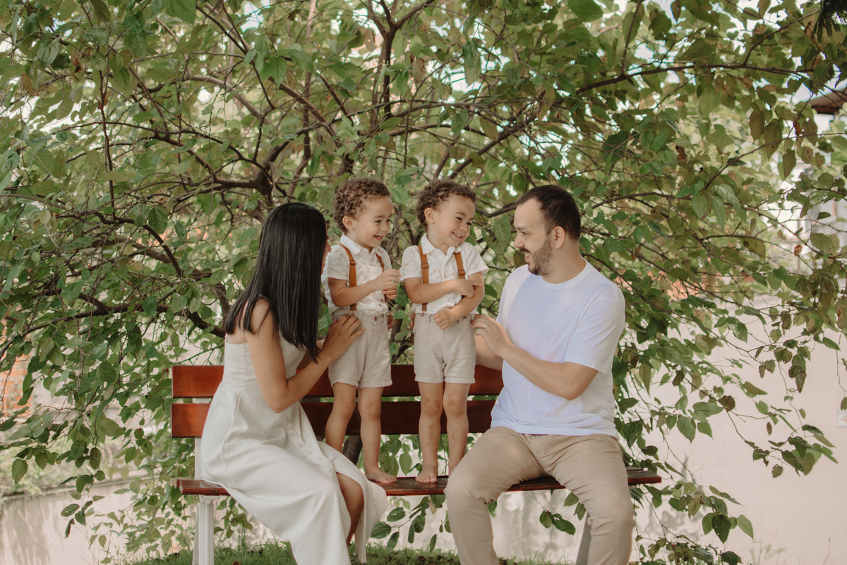 Estive com eles durante a gestação, registrando a espera dos gêmeos. E agora, com eles crescidos, encontrei essa família linda — ainda mais unida, ainda mais cheia de vida.